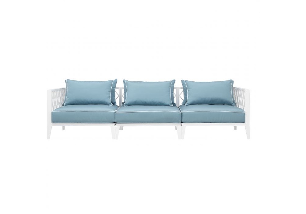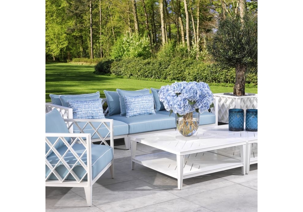 Sofa Ocean Club conçu par Eichholtz est un canapé réalisé avec des matériaux robustes pour votre véranda ou pour vos espaces extérieurs. Avec un cadre blanc et des coussins moelleux, il offre une assise ultra-confortable. Les housses de coussin bleues Sunbrella sont finies avec un passepoil blanc.
