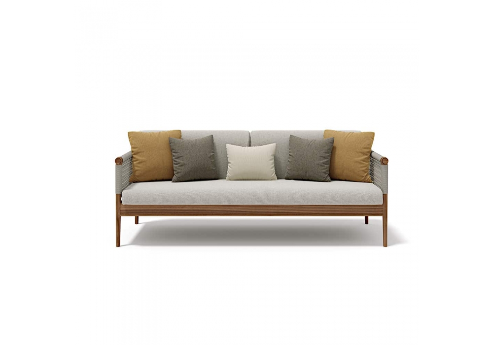 Lodge conçu par Atmosphera est un canapé d'extérieur composé d'une structure en teck avec corde tressée et coussin d'assise en tissu. Disponible en différentes finitions.