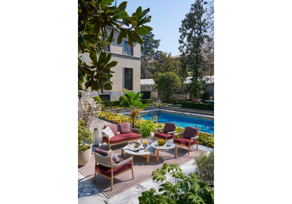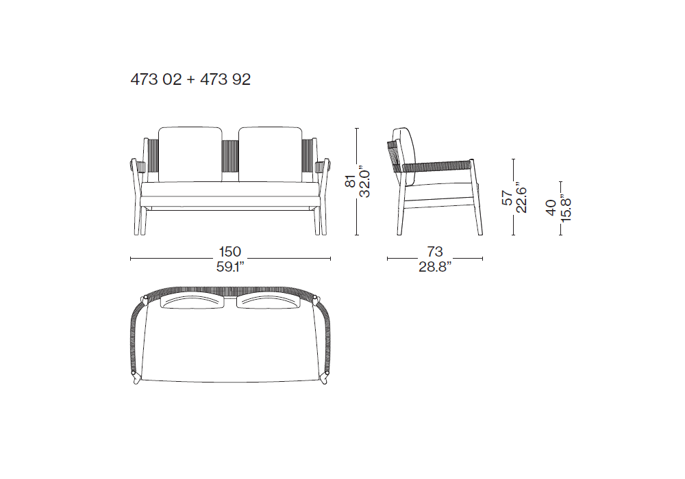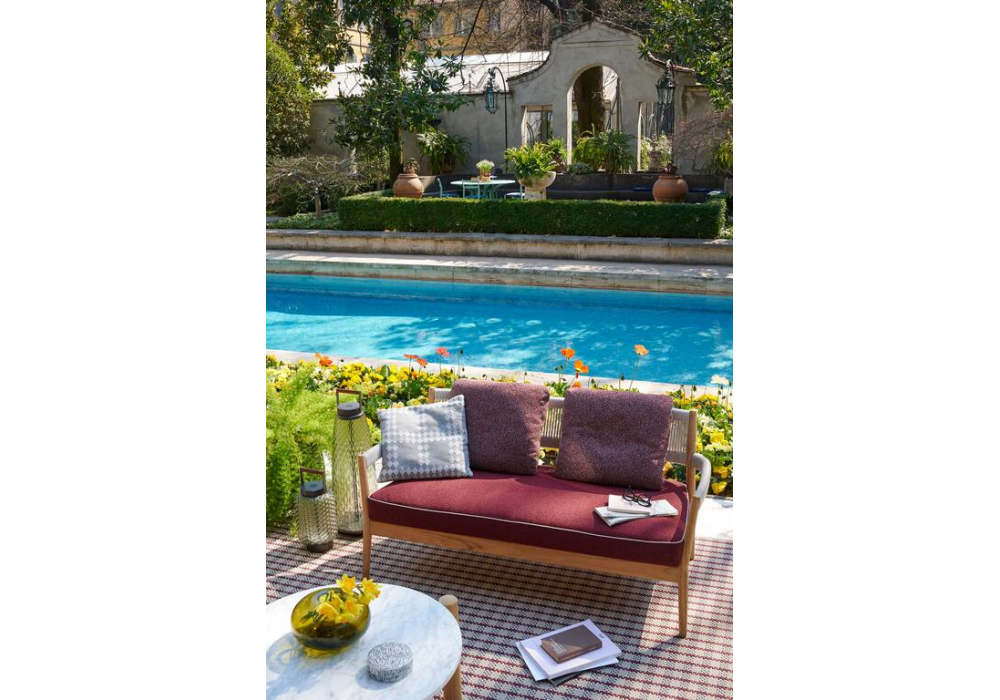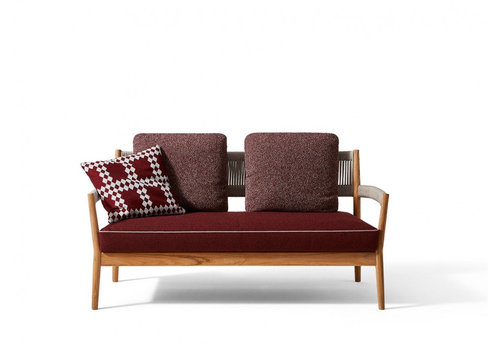 Dine Out conçu par Rodolfo Dordoni pour Cassina est un petit canapé 2 places pour l'extérieur réalisé avec des accoudoirs et un dossier suspendus en corde Orbettino et une structure en bois de teck naturel massif. Rembourrage en tissu dans différentes finitions. Coussins d'assise avec profil en gros-grain gris contrasté.