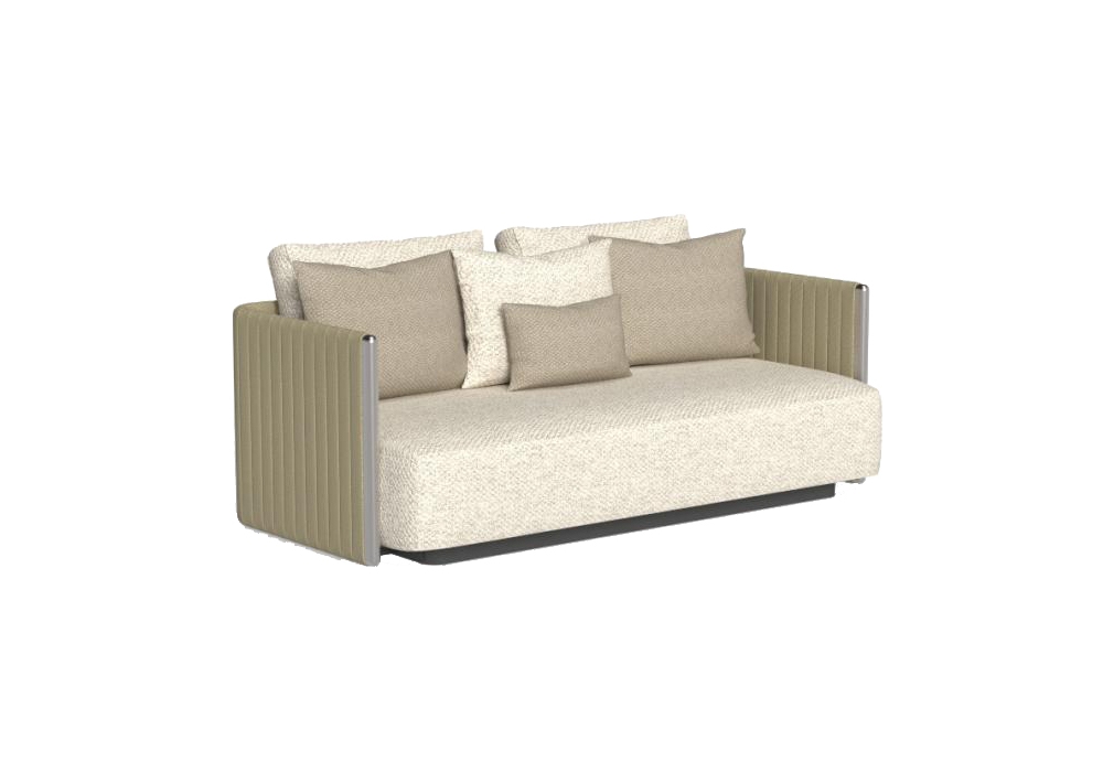 George conçu par Ludovica et Roberto Palomba pour Talenti est un canapé d'extérieur avec des sangles rembourrées tissées sur une structure en acier et des coussins rembourrés en tissu.