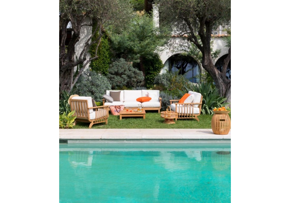 Chelsea produit et signé par Unopiù est un canapé avec structure en teck naturel. Les coussins sont recouverts de tissu acrylique de différentes couleurs. Chelsea est disponible en différentes tailles.