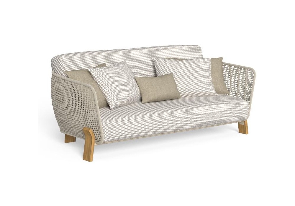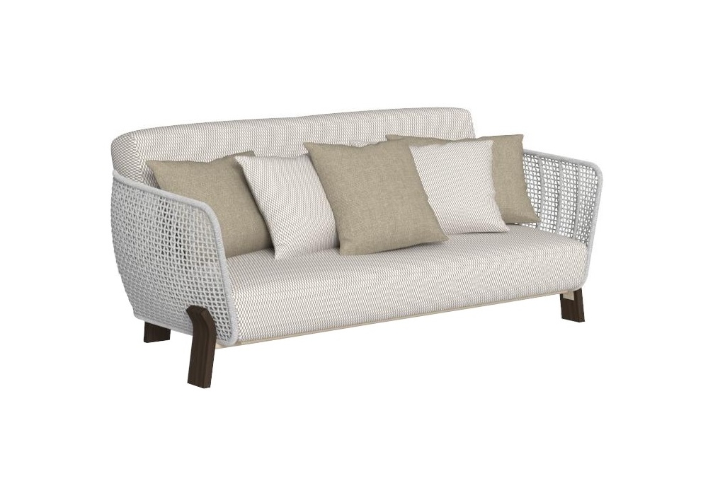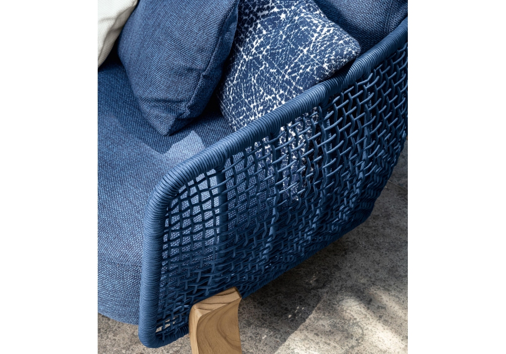 Argo Wood conçu par Ludovica + Roberto Palomba pour Talenti est un canapé Love Seat pour l'extérieur. Il est composé d'une structure tubulaire en aluminium recouverte d'un tressage de cordes en tissu synthétique, de pieds courbés en bois d'acoya disponibles en coloris palissandre ou teck naturel. Les coussins sont déhoussables et recouverts de tissus d'extérieur résistants aux intempéries.