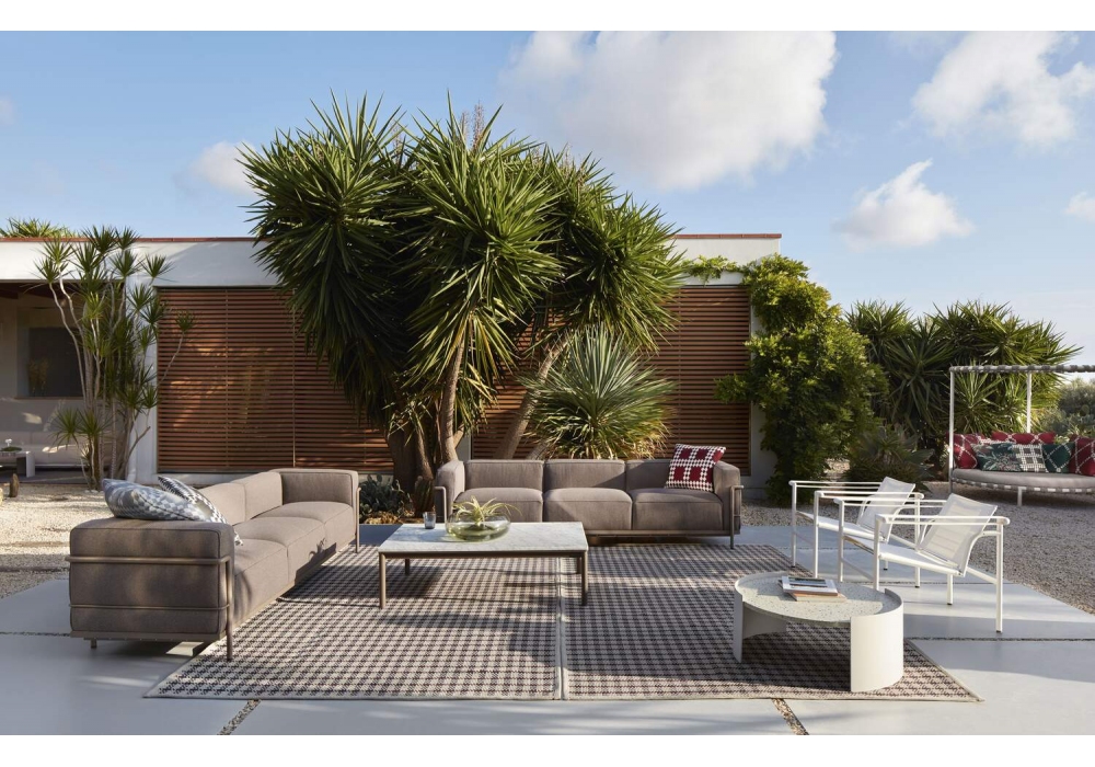 3 Fauteuil Grand Confort, Grand Modèle, Outdoor conçu par Le Corbusier, Pierre Jeanneret, Charlotte Perriand pour Cassina est un canapé réalisé avec une structure en acier inoxydable et une peinture spéciale en relief de différentes couleurs. Les coussins sont recouverts d'un tissu hydrofuge pour assurer une durabilité et une fiabilité maximales dans toutes les conditions météorologiques. Disponible en 2 dimensions.