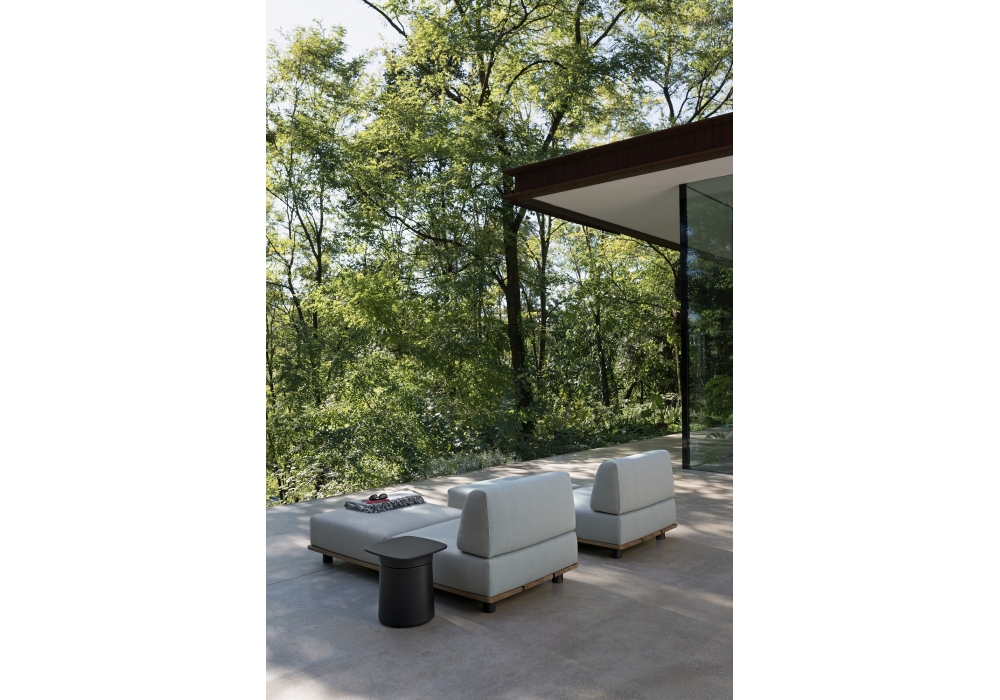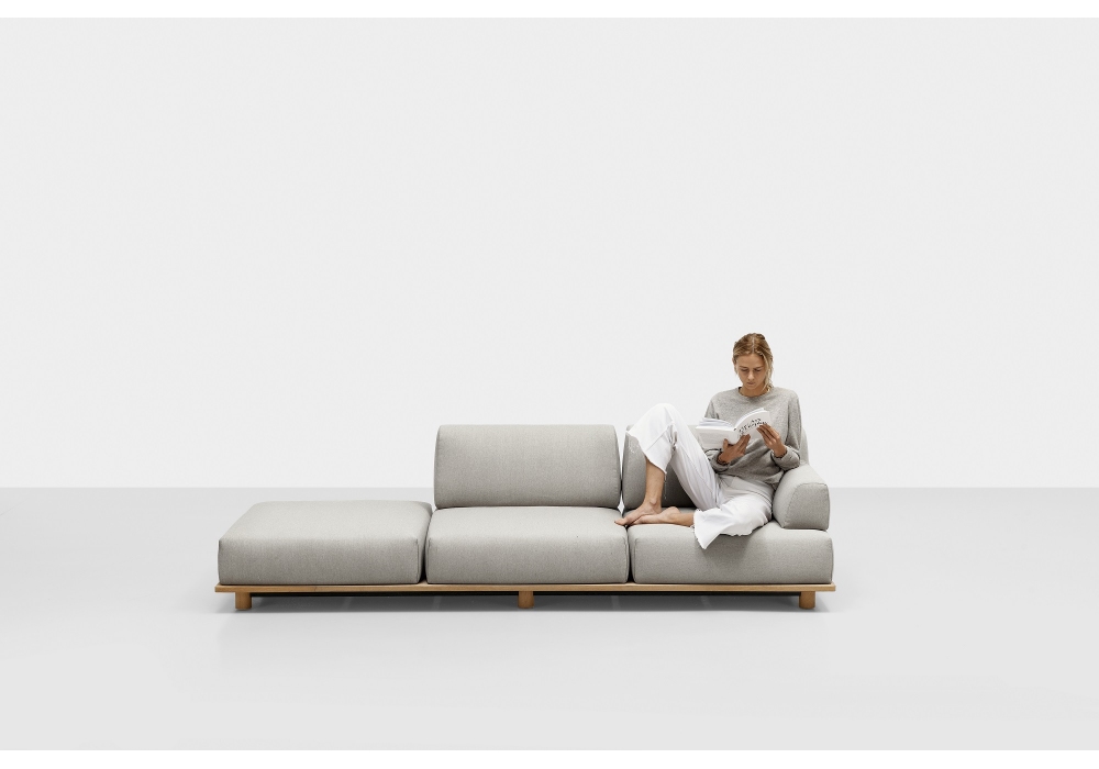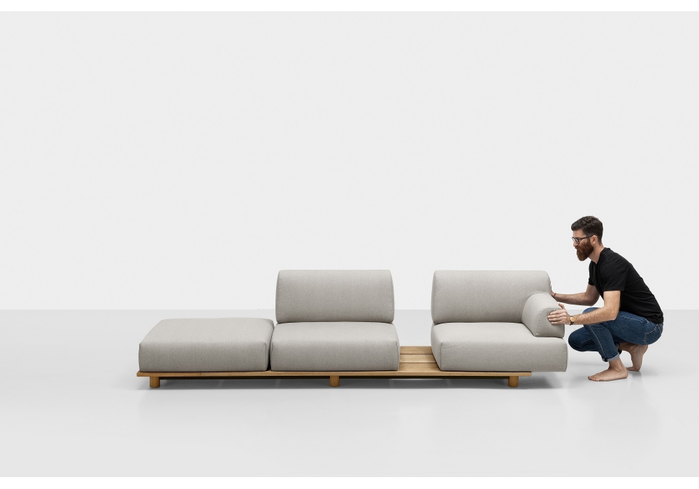 Palco conçu par Sam Hecht & Kim Colin pour Kristalia est un système de sièges d'extérieur composé d'un socle à lattes en teck avec piètement en méta et un ou plusieurs éléments rembourrés, qui peuvent être utilisés seuls ou combinés pour créer différentes configurations. Revêtement proposé en tissu dans une large gamme de coloris.