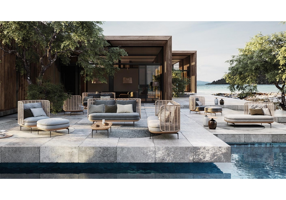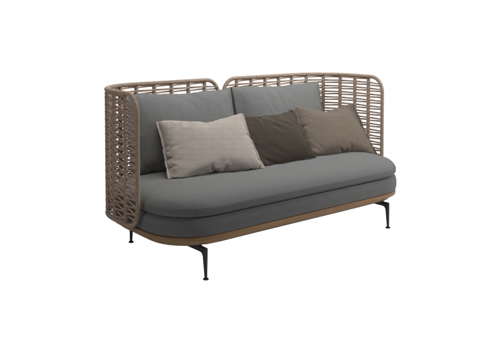 Mistral conçu par Henrik Pedersen pour Gloster est un canapé d'extérieur composé d'une structure en aluminium thermolaqué et teck naturel. Panneaux arrière en osier tressé.