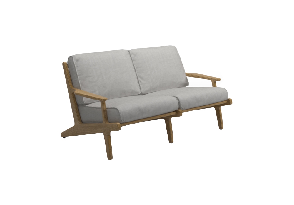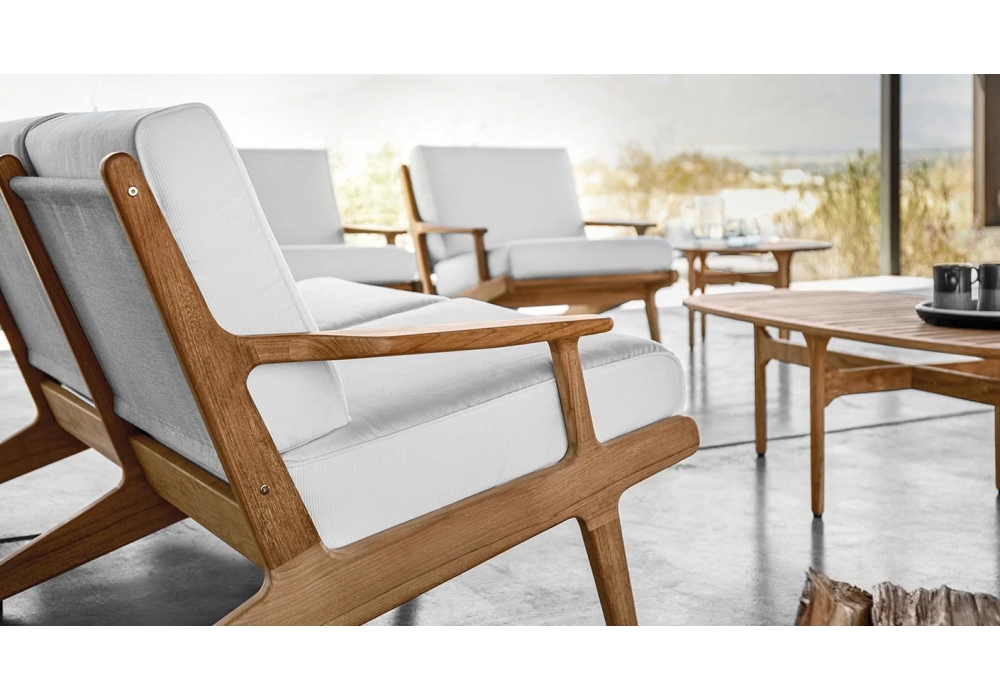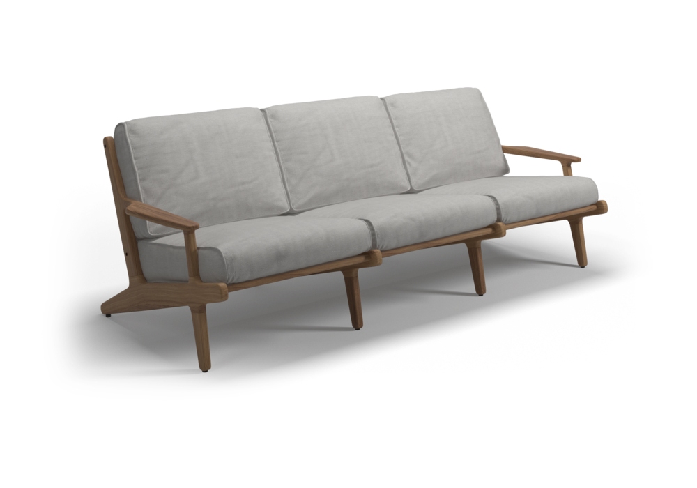 Bay conçu par Henrik Pedersen pour Gloster est un canapé d'extérieur composé d'une structure en teck avec assise et dossier en toile et de coussins recouverts de tissu d'extérieur.