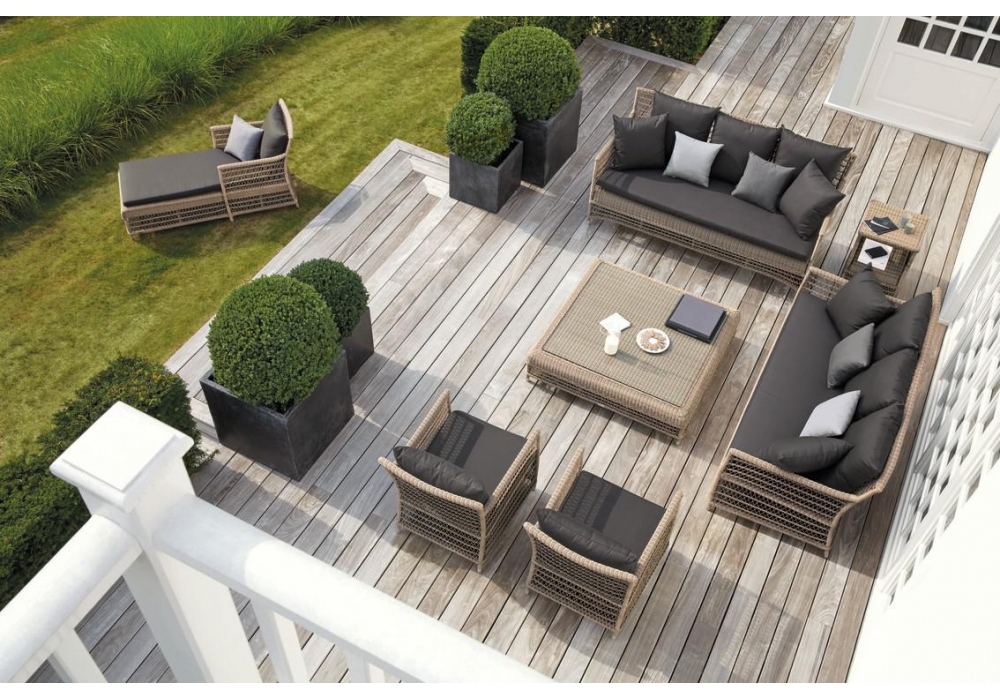 Malibu conçu par Stephane De Winter pour Manutti est un canapé d'extérieur avec structure en osier tressé. Rembourrage disponible en différentes finitions.