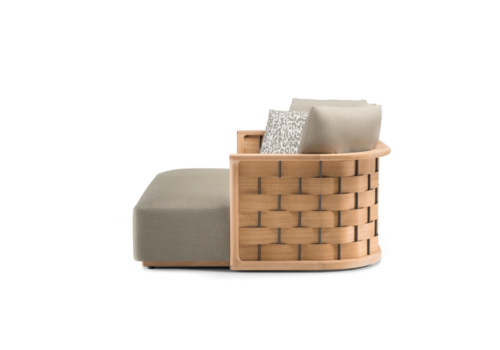 Palinfrasca conçu par Vincent Van Duysen pour Molteni&C est un canapé réalisé avec structure en teck massif, coque avec bandes tissées en teck ou en polyuréthane EVA vert olive. Rembourrage en polyuréthane et revêtement en tissu. Disponible en différents modèles.
