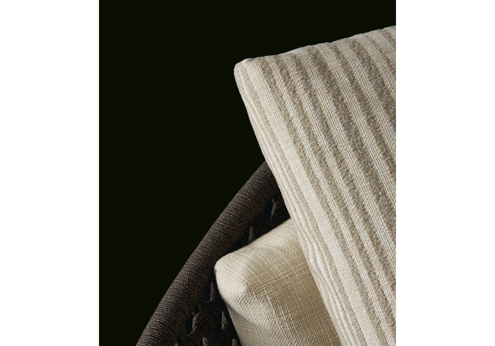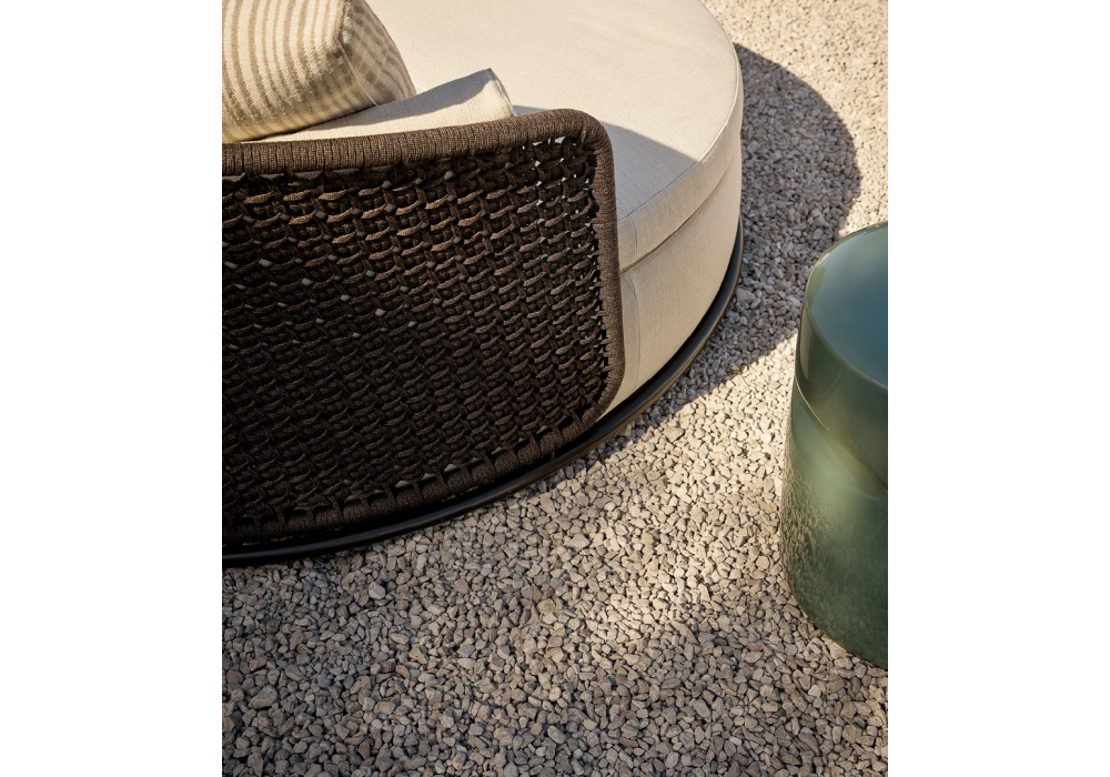 Soori conçu par Soo Chan pour Poliform est un daybed avec structure de dossier en tube d'acier inoxydable recouvert de ruban de polypropylène et dossier en ruban tissé. Base en tube d'acier inoxydable peint en brun mat. Pieds en matière thermoplastique. Coussin d'assise en polyuréthane souple moulé. Coussins de dossier et de confort en polyester PET recyclé. Prérevêtement en fibre de polyester avec coutures thermocollées. Housse amovible en tissu.