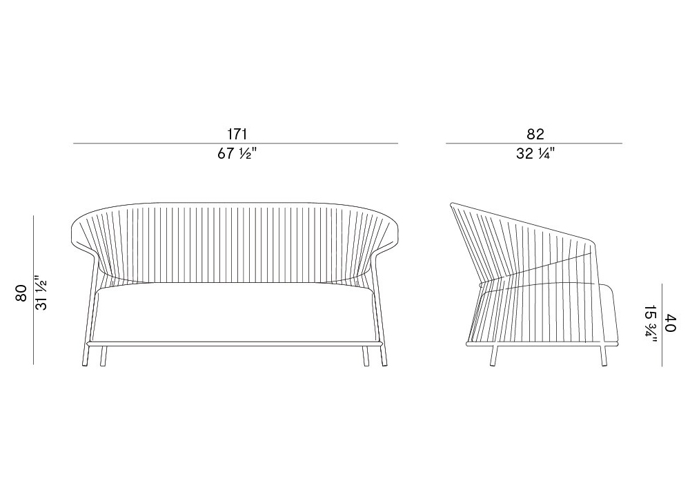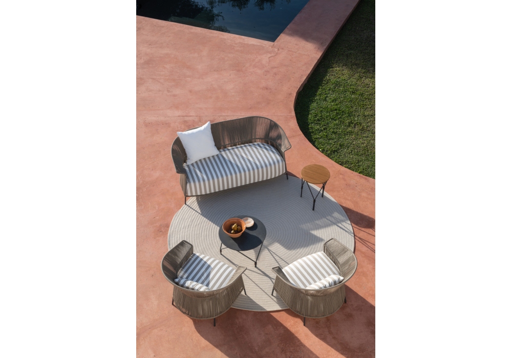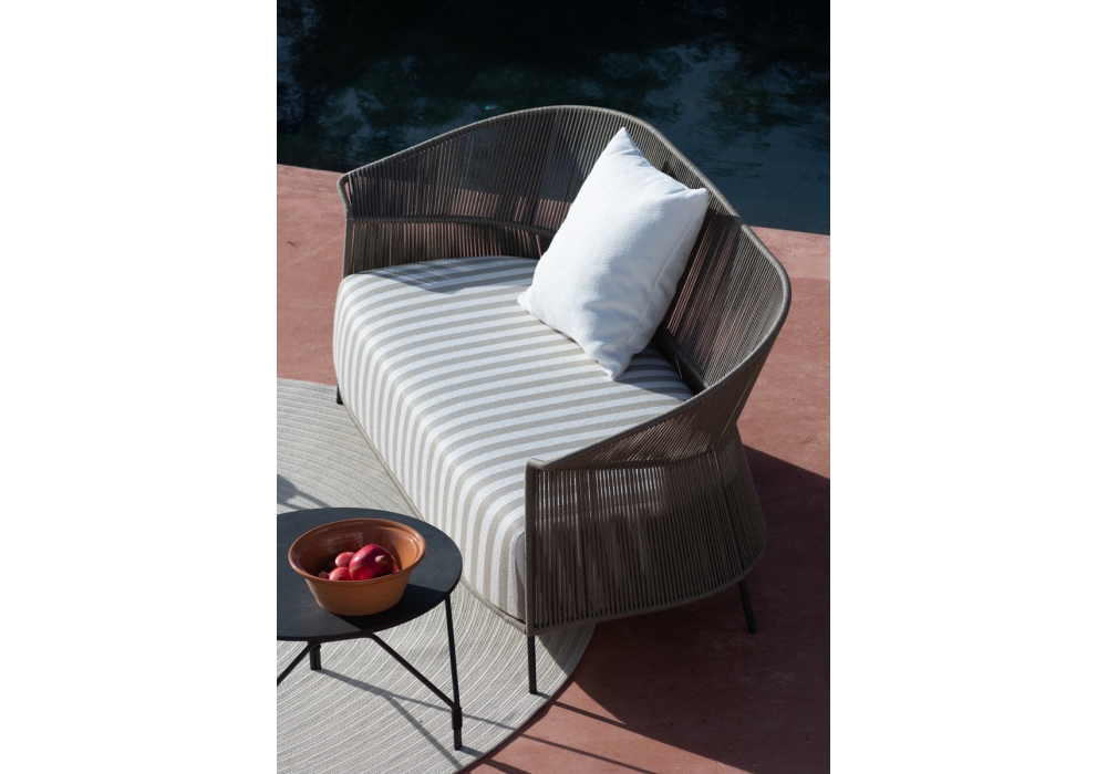 Ola conçu par Radice Orlandini pour Potocco est un canapé d'extérieur structuré en métal peint en différentes finitions. L'assise et le dossier sont recouverts d'un tissage Fly rope de 8 mm. Housse de coussin en différents tissus.