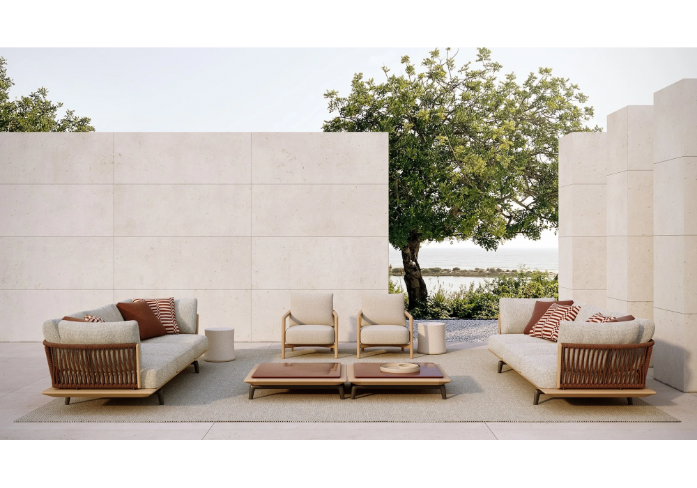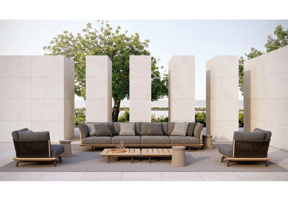 Lagoon conçu par Emmanuel Gallina pour Poliform est un canapé avec une base en teck massif et des pieds en aluminium peint en relief de couleur oxyde. Le dossier est en tube d'acier inoxydable recouvert de corde dans les tons brique et marron foncé ou de corde torsadée naturelle. Les coussins sont en polyester PET recyclé avec inserts en polyuréthane à densité différenciée. Le revêtement est déhoussable.
