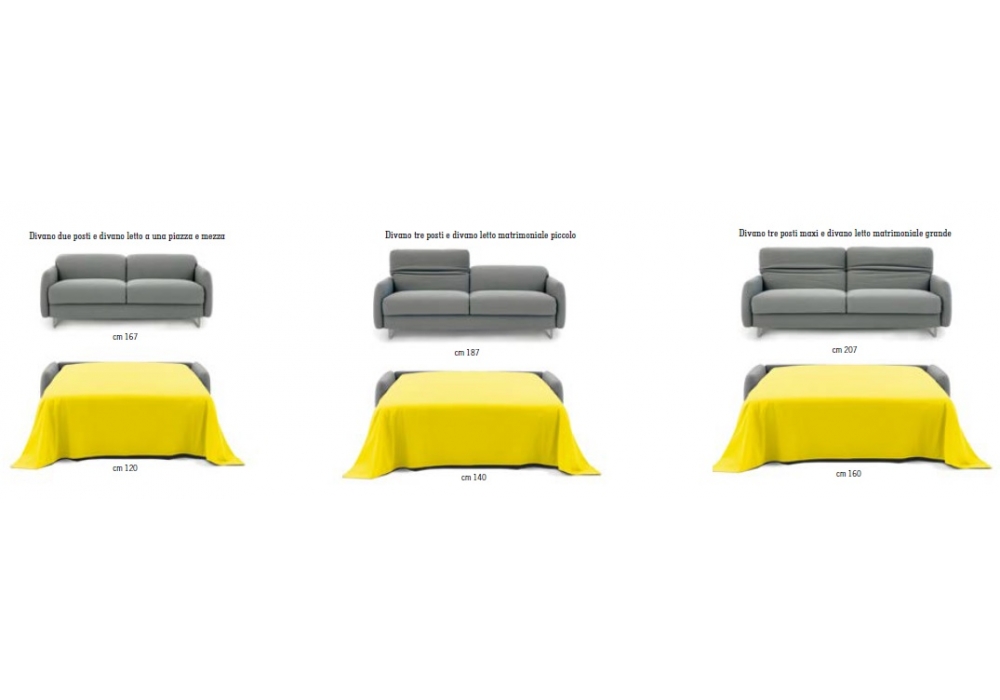 Plan conçu par Campeggi est un canapé-lit avec dossier rabattable qui permet un agencement de soutien personnalisé, tandis que le lit est immédiatement prêt sans enlever les coussins. Sommier avec lamelles en hêtre laminé et matelas en mousse de polyuréthane ou matelas à ressorts. Également disponible en 3 dimensions.