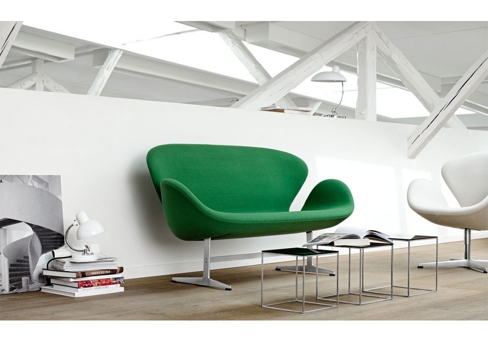 Swan conçu par Arne Jacobsen pour Fritz Hansen est un canapé avec revêtement en tissu ou cuir et base en aluminium poli satiné. Disponible en différentes finitions.