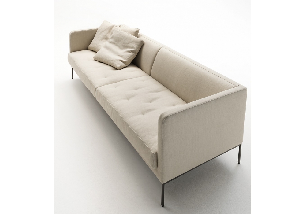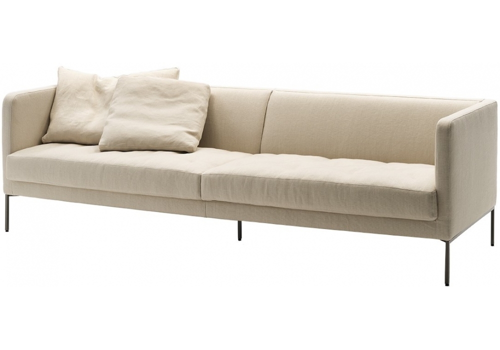 The Easy Lipp sofa designed by Piero Lissoni for Living Divani moulds environments with character and lightness, hosting daily moments of relax. Fix and modular sofa with backrest and armrest frame in doublepaneled pinewood and padding in polyurethane foam and acrylic fibre layers; seat chassis in 40x30mm tubular steel with black epoxy powder coating, sprung with elastic straps inset in the base structure in multilayer poplar wood padded in polyurethane foam covered in 100% polyether thermally bonded onto a polyamide velveteen backing. Backrest cushions, fixed to the structure through the coverings, in polyurethane foam and acrylic fibre layers. Quilted seat cushions, in prewashed and sterilized goose down, stitched into separate compartments, with differentiated density polyurethane foam insert. Additional loose cushions, available in two sizes (50 x 50 cm o 70 x 50 cm); fabric or leather upholstery, both fully removable by zippers. Grosgrain piping when in fabric and piping in the same finish as the seat when in leather. Tubular steel feet, joined by a bracket in square section 15 x 15 mm, with bronzed epoxy powder coating with adjustable black PVC tips. Fabric or leather upholstery, with sewn stitching at sight on seat cushion only, both fully removable by zippers and Velcro fastenings.
