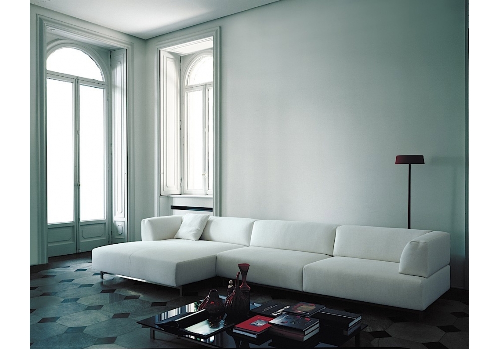 Metro² designed by Piero Lissoni for Living Divani is both original and elegant, appealing to those keen on socialising and brilliant conversation. Modular sofa with lacquered steel frame. Support in beech plywood slats. Armrests and backrests structure in double-panelled poplar and pine. Pin and bush enabling the backrest and armrest to be unhooked from the frame to allow removal of the covers, for fabric upholstery only. Padding with differentiated density polyurethane foam. Covering in needle punched, resinated, nonwoven polyester fibre, bonded onto a polyamide velveteen backing. Steel base with satin nickel-finish. Fabric or leather upholstery. The fabric version only is fully removable by zippers and Velcro fastenings. The various elements are joined together by means of hooks. Seat depth 65cm.