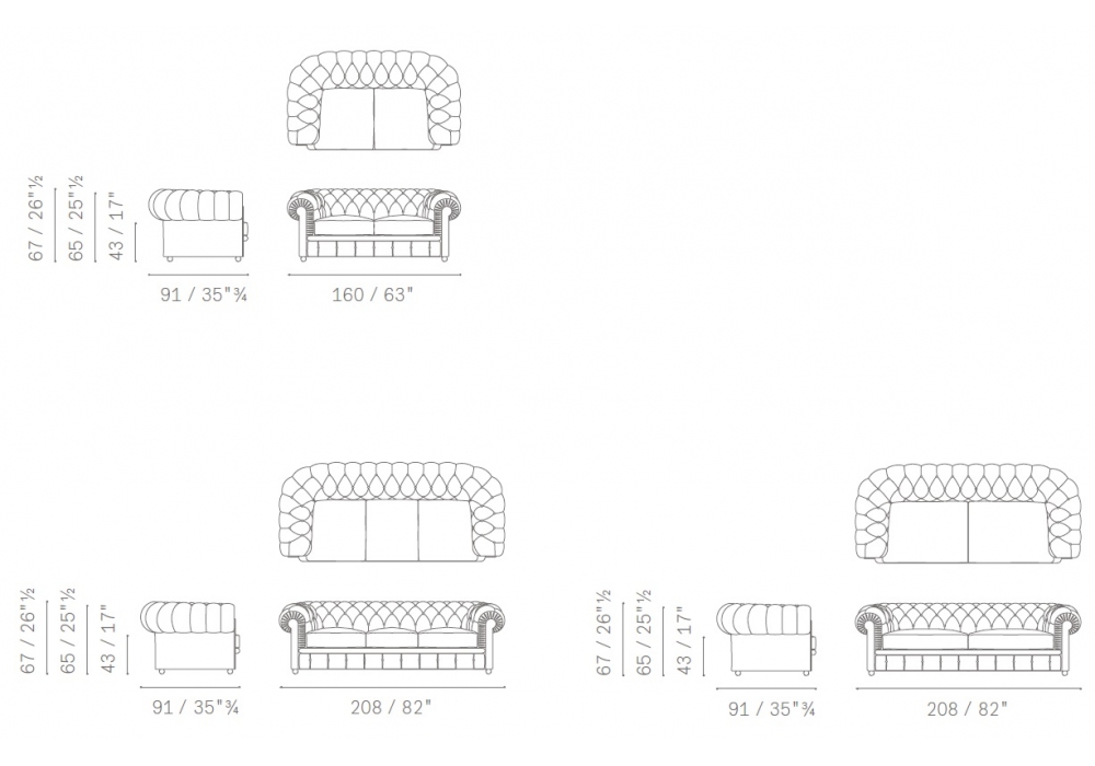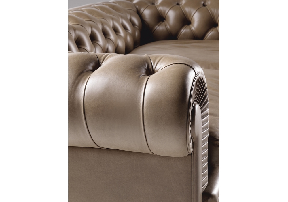 Chester, conçu par Poltrona Frau, est un canapé dont la structure porteuse est en bois de hêtre séché et dont le coussin d'assise est rempli de duvet d'oie. Le dossier et les accoudoirs présentent un design capitonné fait à la main. Le dossier extérieur est terminé par une rangée de clous recouverts de cuir. Les pieds sont disponibles dans les versions suivantes : sphérique (6 cm) ou haut (12 cm) en hêtre teinté noyer foncé ou en hêtre laqué noir ; pieds en bois (13,7 cm) recouverts de cuir.