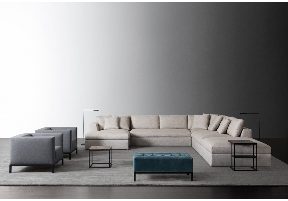 Louis Plus designed by Andrea Parisio for Meridiani is a modular sofa with wooden frame and non-deformable polyurethane padding. Black ABS feet. Upholstery available in fabric or leather. Made of different sizes with possibility of different modular configurations.