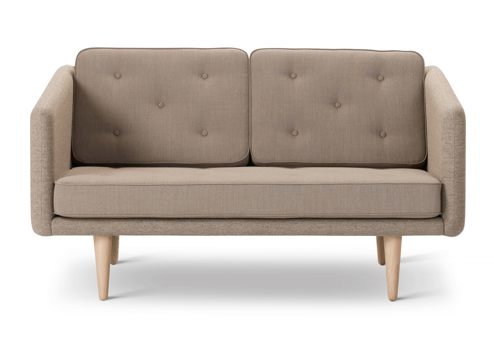 No. 1 conçu par Børge Mogensen pour Fredericia est un canapé deux ou trois places avec structure en chêne massif et revêtement en différents tissus. Les coussins d'assise et de dossier sont séparés et réalisés en mousse solide CMHR ou HR, recouverts de tissu et montés avec des boutons.