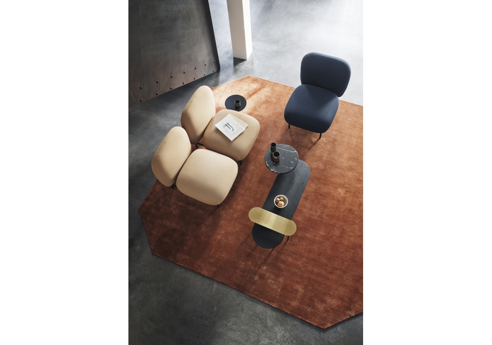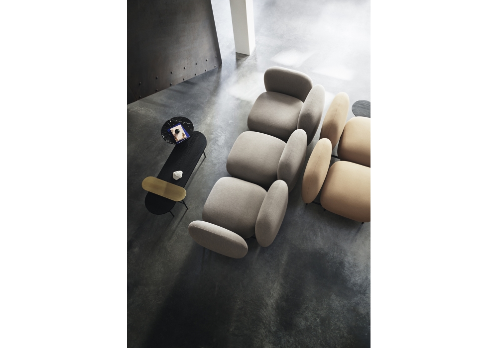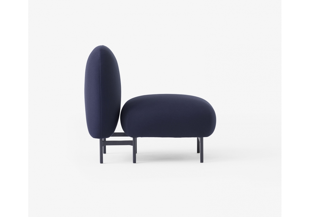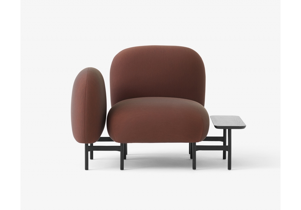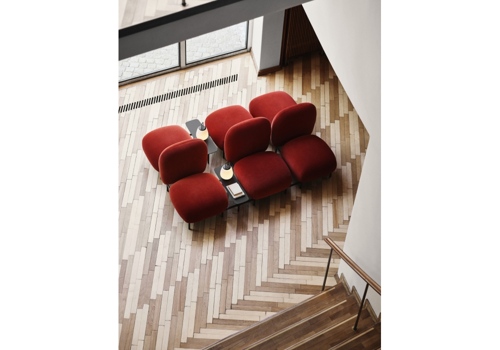 Isole conçu par Nendo & Luca Nichetto pour &Tradition est un système d'assises modulaire composé d'une base en acier thermolaqué, d'une assise, d'un dossier et d'accoudoirs en mousse HR moulée. Plateaux de table en MDF noir avec surface nanolaminée. Le revêtement est réalisé en tissus extensibles adaptés aux environnements domestiques et contractuels.