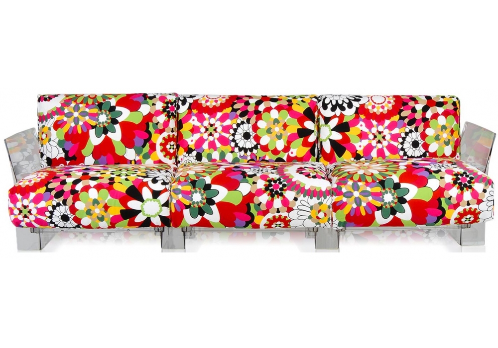 Pop Missoni conçu par Piero Lissoni & Carlo Tamborini pour Kartell est un canapé réalisé avec une structure en polycarbonate transparent et des coussins d'assise et de dossier en duvet d'oie et arc. Revêtement déhoussable en tissu Missoni.