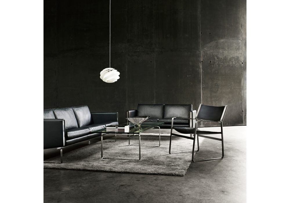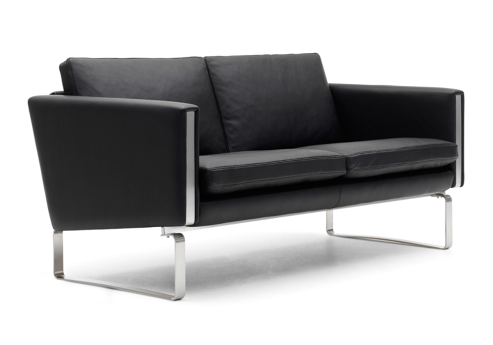 CH102 conçu par Hans J. Wegner pour Carl Hansen & Søn est un canapé avec structure et façade des accoudoirs en acier inoxydable. Assise, coussin, dossier et accoudoirs entièrement recouverts de cuir.