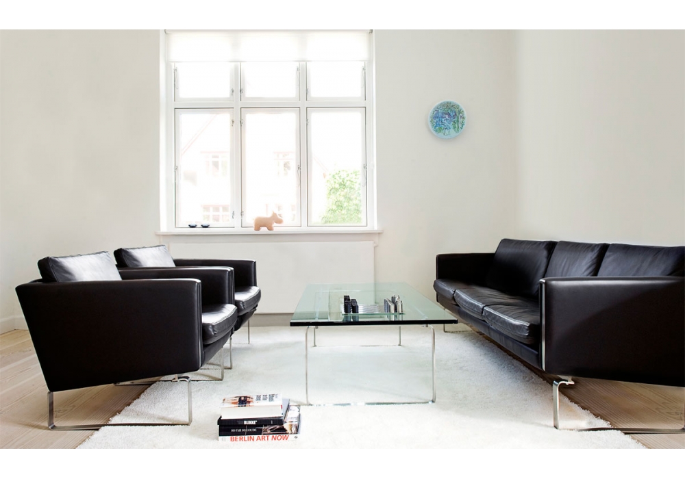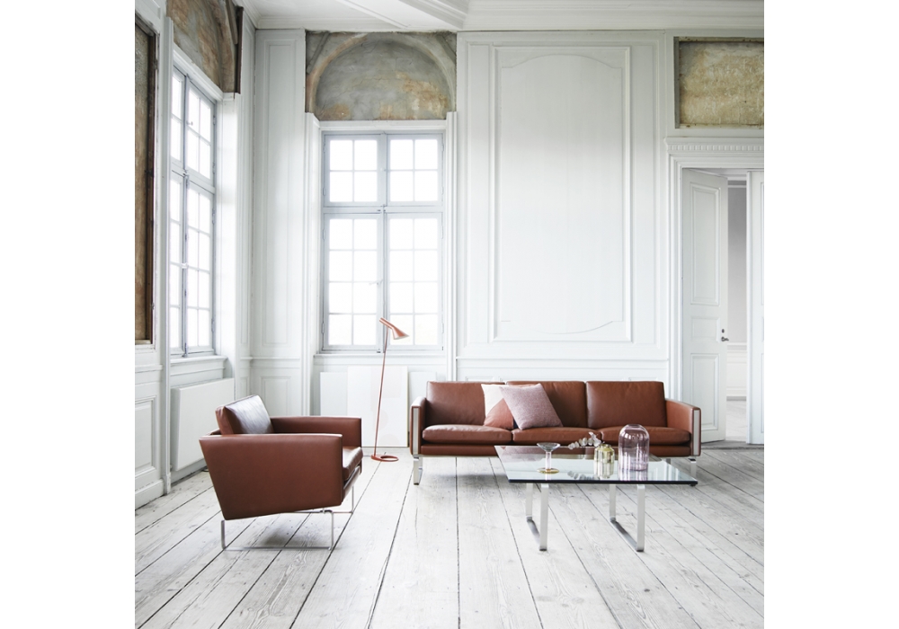 CH103 conçu par Hans J. Wegner pour Carl Hansen & Søn est un canapé avec structure et façade des accoudoirs en acier inoxydable. Assise, coussin, dossier et accoudoirs entièrement recouverts de cuir.