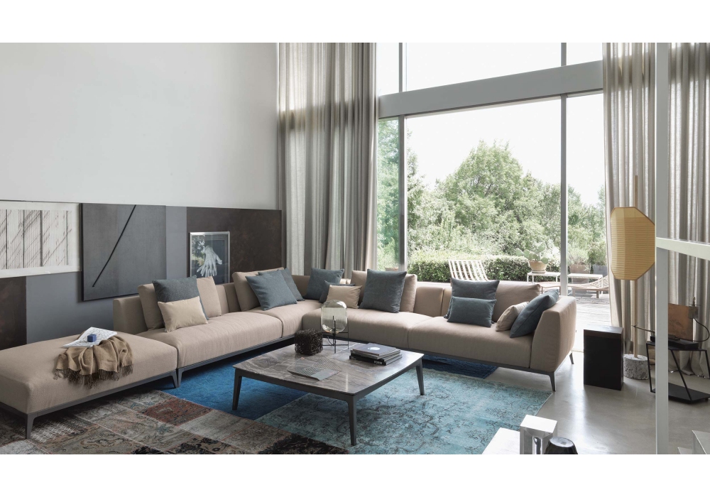 Olivier conçu par Emanuela Garbin & Mario Dell'Orto pour Flou est un canapé modulable disponible en plusieurs configurations. Structure en tubes d’acier, finition brunie mate et assise avec sangles élastiques tressées revêtues de tissu jersey. Assise et dossiers avec revêtement déhoussable en tissu ou cuir.