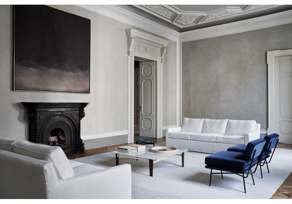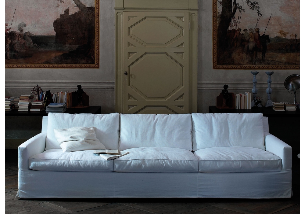 Cousy conçu par Vincent Van Duysen pour Arflex est un canapé avec revêtement en tissu ou en cuir. Pieds arrière en hêtre massif, roues avant.
