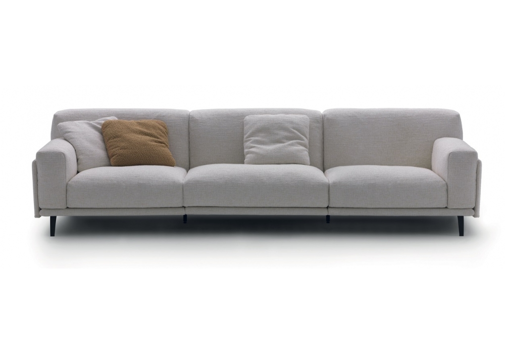 Frame conçu par Carlo Colombo pour Arflex est un canapé fixe ou modulaire avec revêtement disponible en tissu ou en cuir. Pieds en laqué noir ou bruni. Coussin d'assise, dossier et accoudoir en polyuréthane profilé à densité différenciée et garnissage en duvet d'oie / anti-plumes.