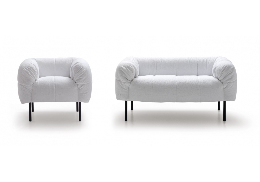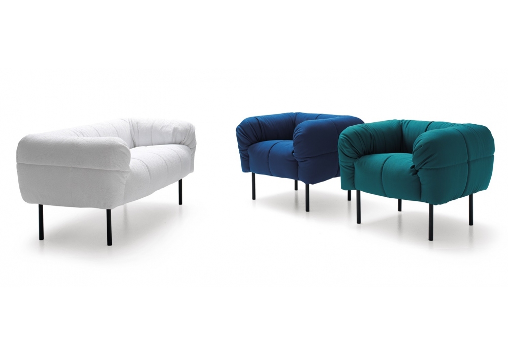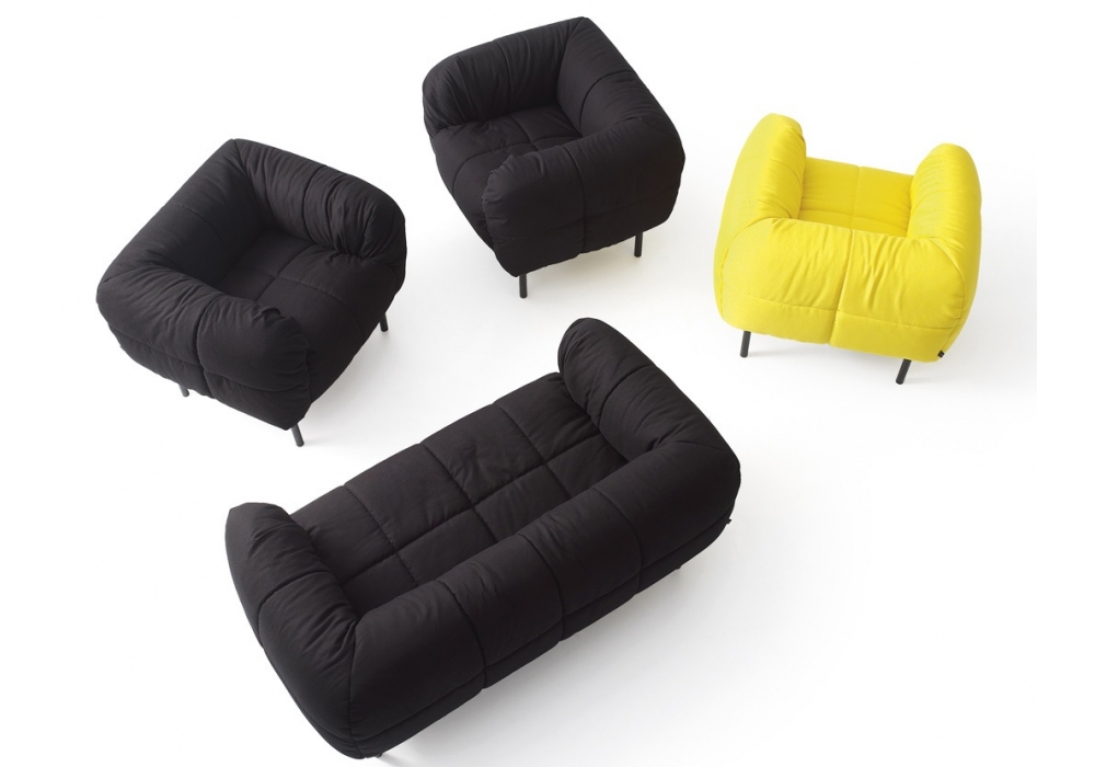 Pecorelle conçu par Cini Boeri pour Arflex est un canapé avec piètement en métal laqué noir. Revêtement en tissu. Le tissu est associé à de la fibre de polyester et du coton.