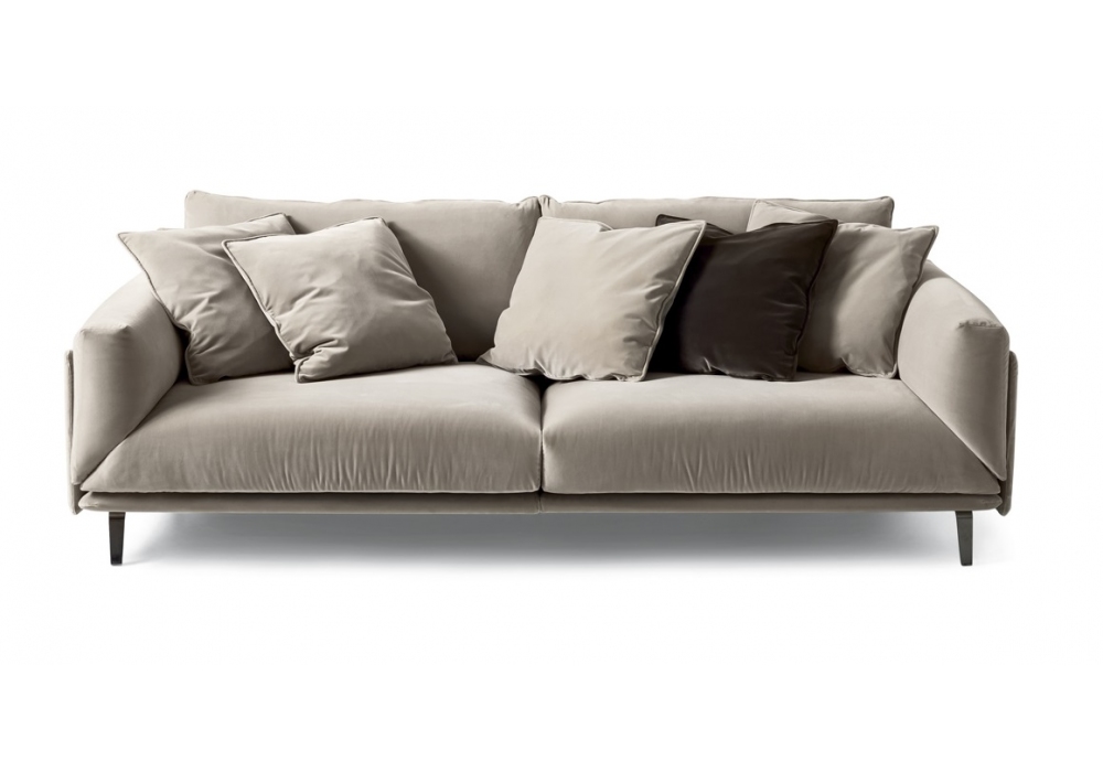 Faubourg conçu par Carlo Colombo pour Arflex est un canapé fixe avec revêtement disponible en tissu ou en cuir. Pieds en laqué noir ou bruni. Coussin d'assise en polyuréthane profilé à densité différenciée / fibre polyester. Coussin de dossier en duvet d'oie / revêtement anti-plumes.