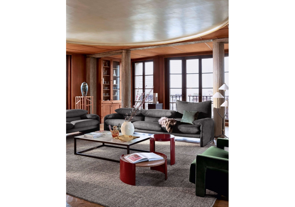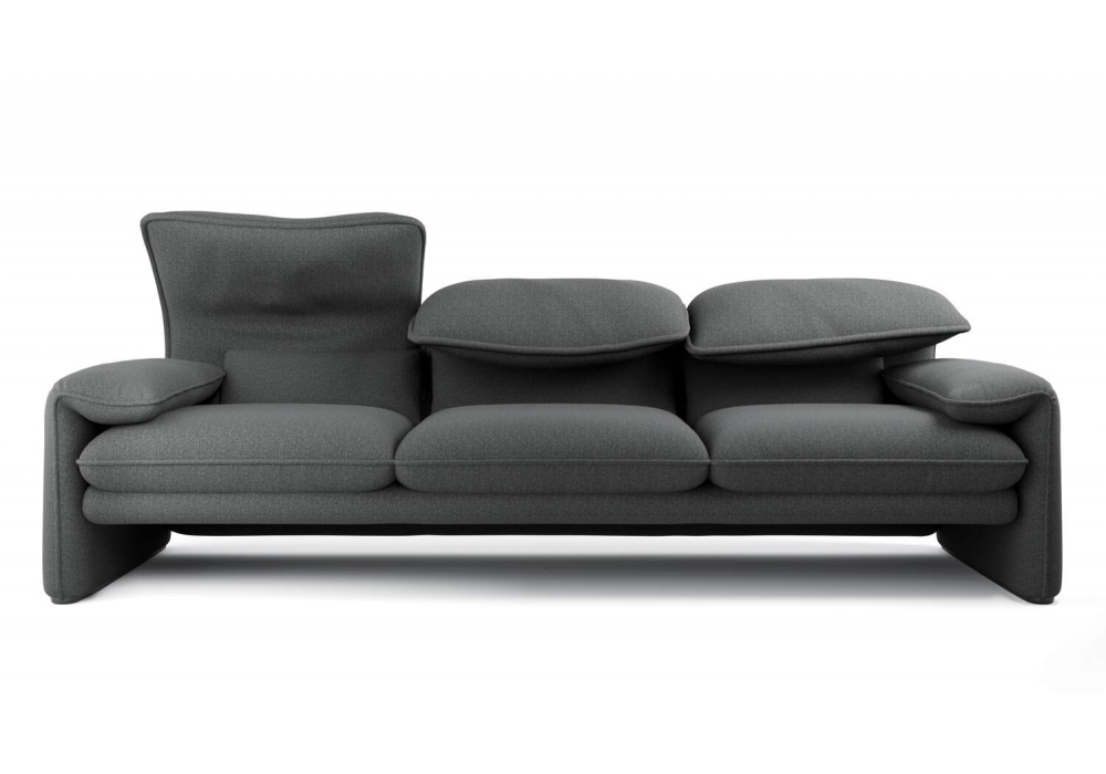 675 Maralunga 40 Maxi conçu par Vico Magistretti pour Cassina est un canapé avec structure en acier, rembourrage en mousse de polyuréthane expansé sans CFC et ouate de polyester. Coussins d'assise en polyuréthane expansé et ouate de polyester. Dossier muni d'un appuie-tête escamotable qui permet l'utilisation aussi bien en version basse qu'en version haute, à convertibilité immédiate. Sur les canapés l'appuietête est individuel et indépendant pour chaque place assise. Disponible aussi en 2 dimensions.