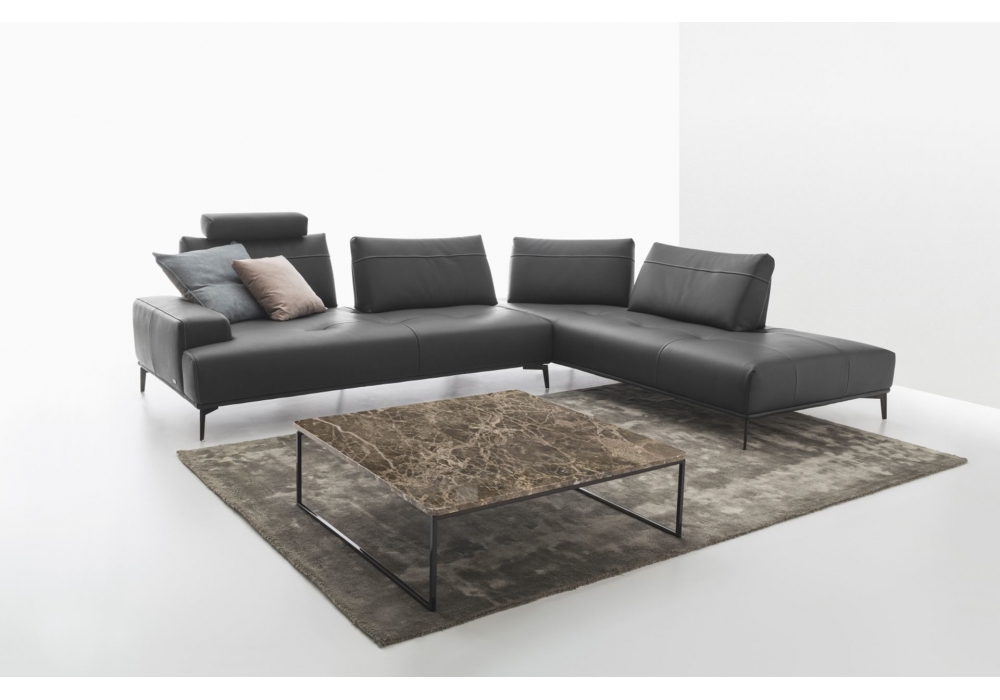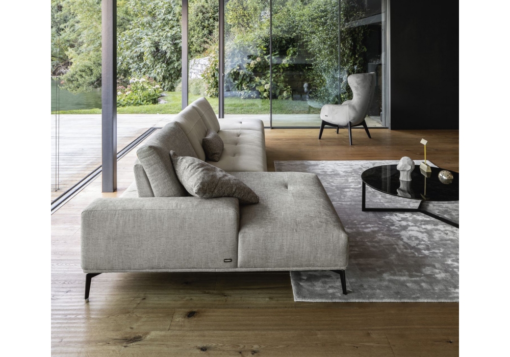 Egeo conçu par Nicoline est un canapé avec structure en bois et contreplaqué avec support en métal et assise avec sangles élastiques. Coussins d'assise en mousse de polyuréthane écologique, revêtement en tissu ou en cuir, non démontables. Pied en métal poli satiné, bronze à canon et peint en couleurs RAL.