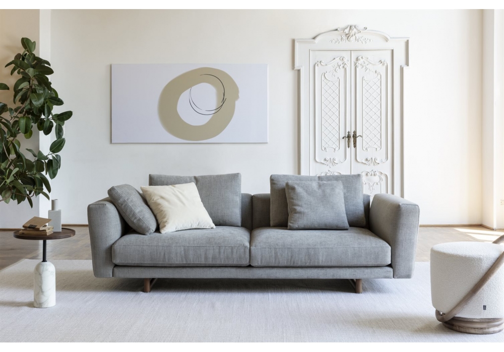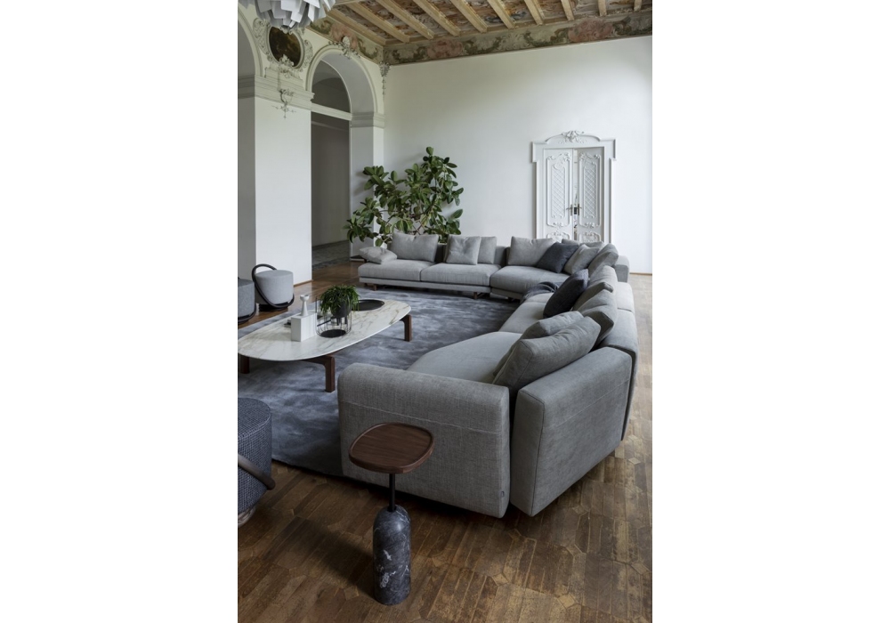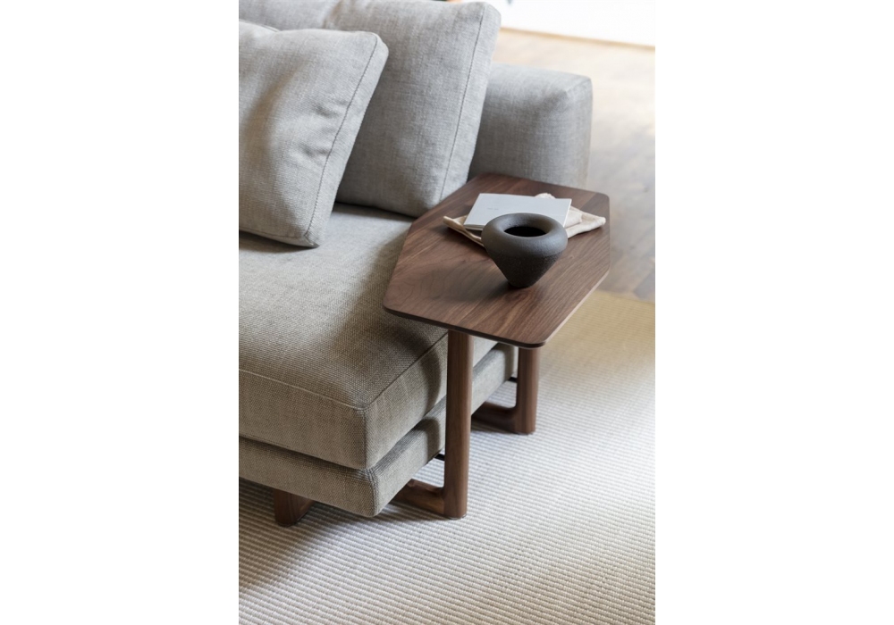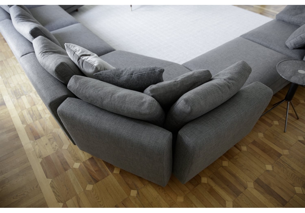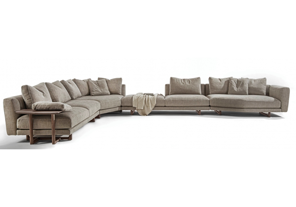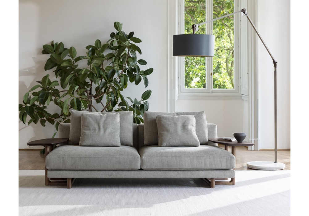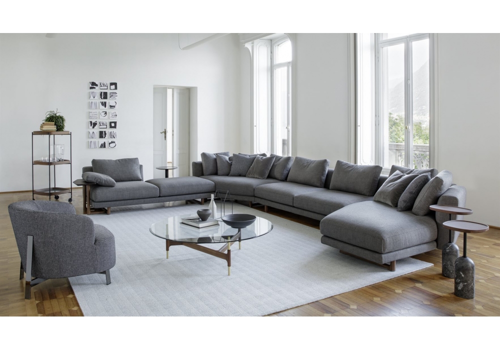 Abacus conçu par Gabriele et Oscar Buratti pour Porada est un canapé modulaire avec base en noyer canaletta massif et embouts en chrome noir et laiton brossé. Revêtement en tissu ou cuir. Les accoudoirs peuvent être rembourrés ou avec une fonction de table basse intégrée en noyer canaletta massif.