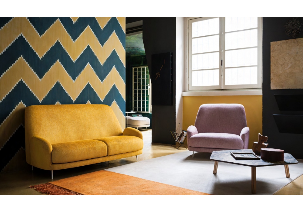Santiago conçu par Claesson Koivisto Rune pour Tacchini est un canapé avec des pieds en métal ou en bois. Couverture disponible en différentes finitions.