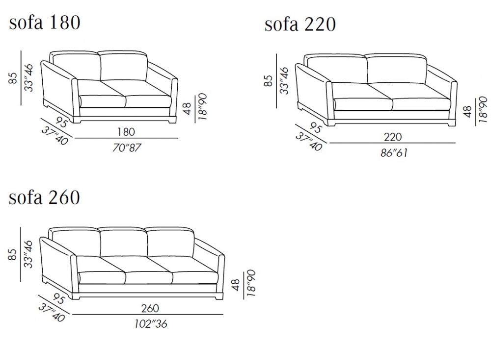 | Dimensions | 180 x 95 x H 85 cm; 220 x 95 x H 85 cm; 260 x 95 x H 85 cm. |