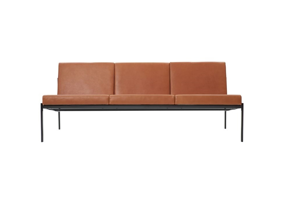 Kiki conçu par Ilmari Tapiovaara pour Artek est un canapé fabriqué avec une structure enduite de poudre noire brillante et un revêtement en tissu ou en cuir. Disponible en 2 dimensions.