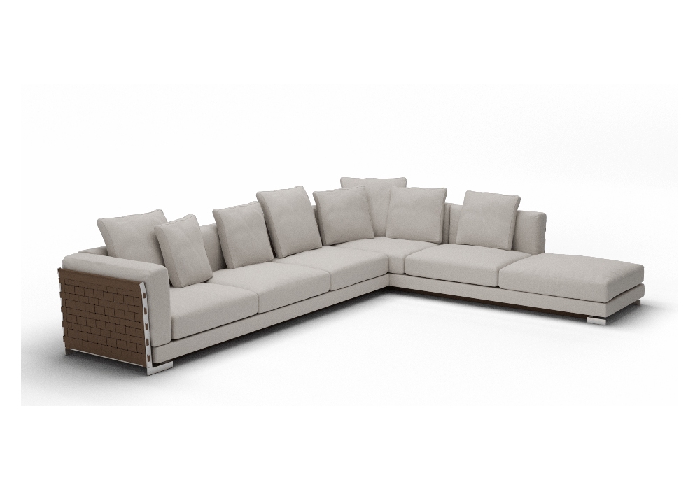 Cestone conçu par Antonio Citterio pour Flexform est un canapé modulable avec dossier et côtés en armatures métalliques recouvertes de cuir tressé et assise en métal et bois massif avec rembourrage en mousse polyuréthane. Les coussins de dossier, d'assise et d'accoudoir sont rembourrés en oie et rembourrés en cuir ou en tissu. Le canapé est disponible en différentes configurations.