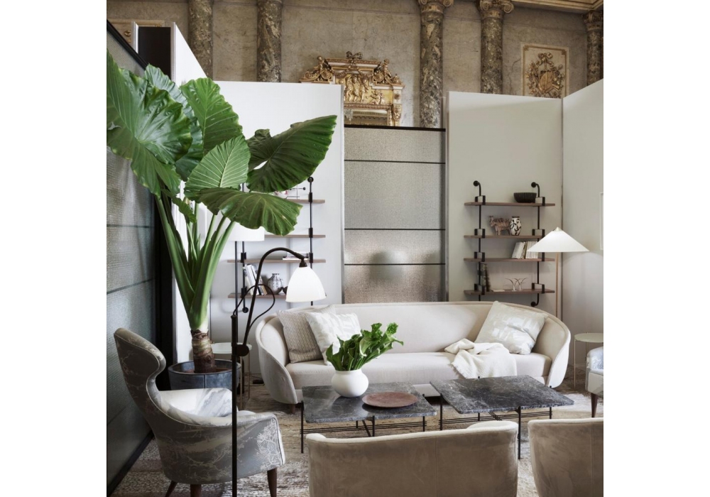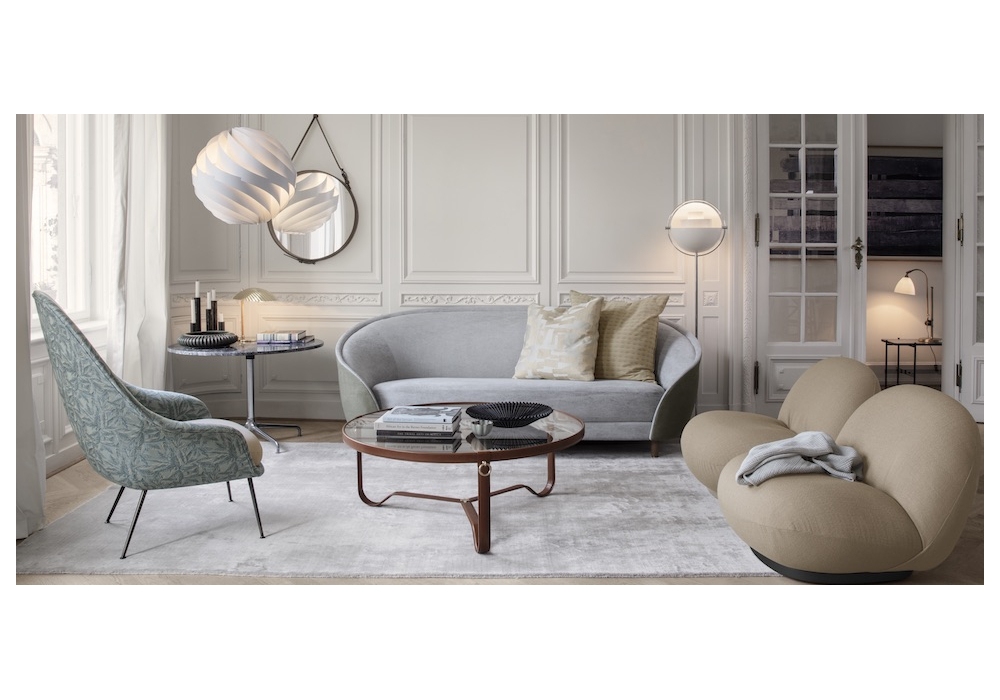 Revers conçu par Gubi est un canapé composé d'une coque entièrement recouverte de tissu ou de cuir et d'un piètement en bois.