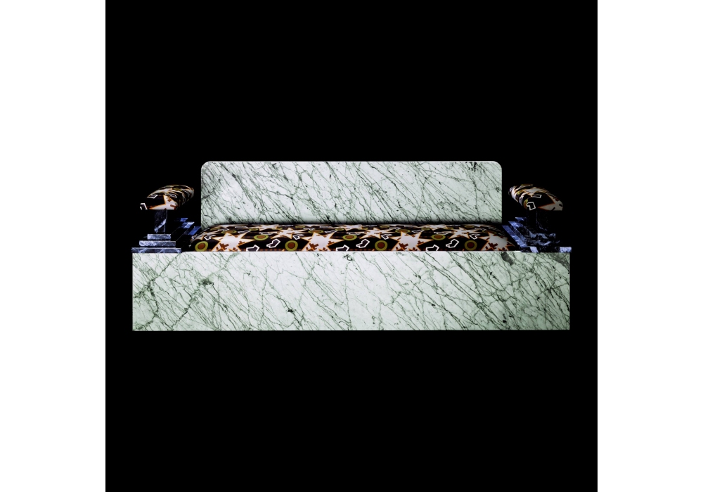 Agra conçu par Ettore Sottsass pour Memphis Milano est un canapé trois places en marbre blanc avec des veines noires. Accoudoirs en marbre noir veiné; l'assise et les accoudoirs capitonnés sont recouverts de tissus en coton imprimé dessinés par Nathalie Du Pasquier.
