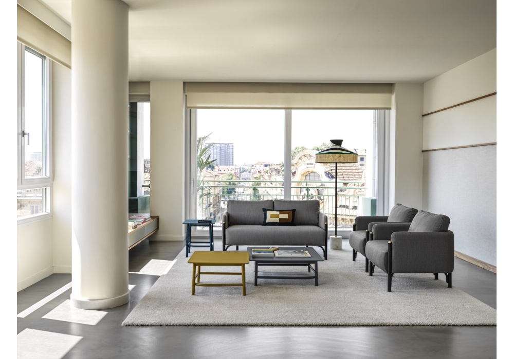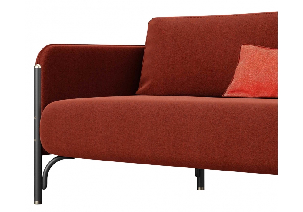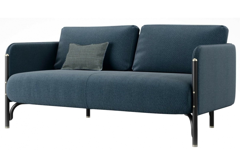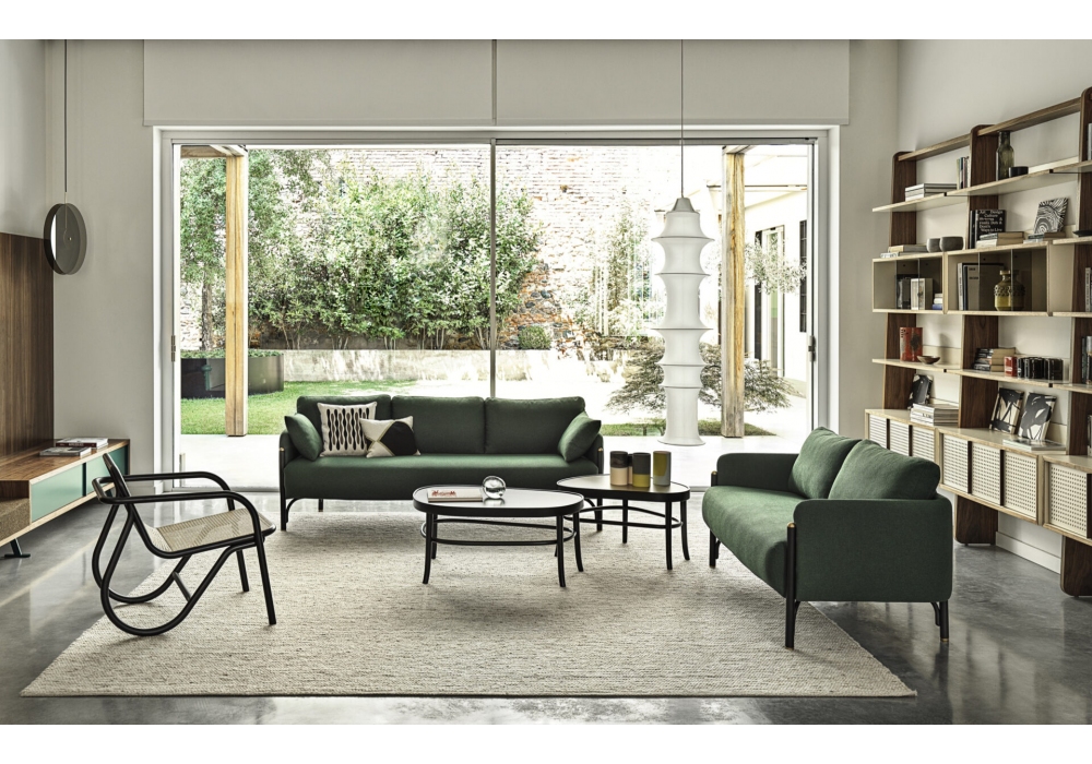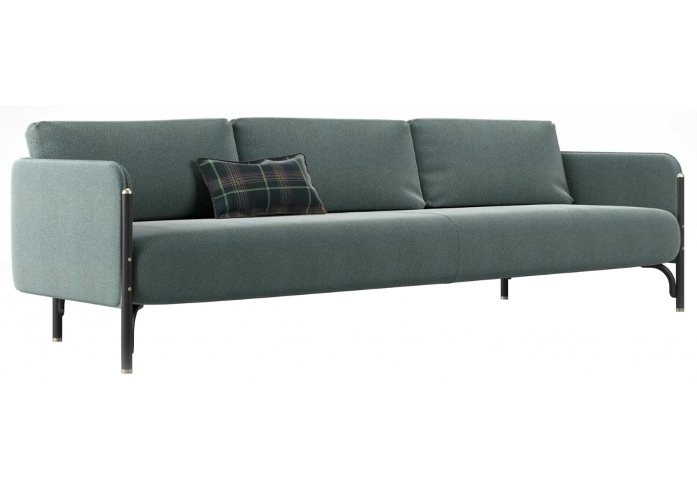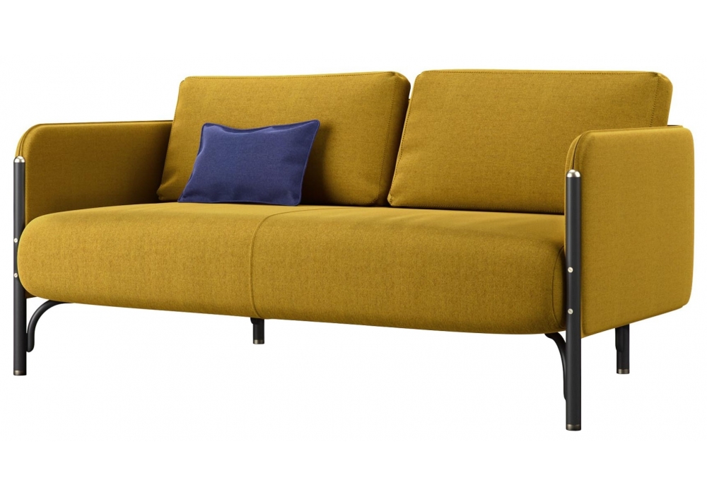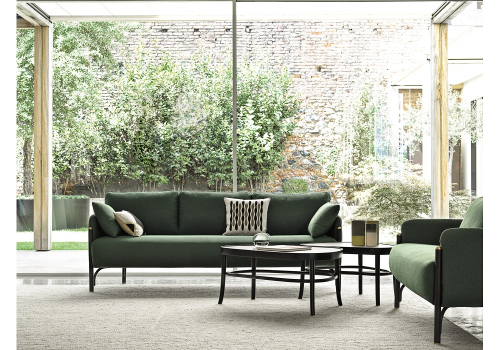 Jannis conçu par Dainelli Studio pour Gebrüder Thonet Vienna est un canapé avec structure en hêtre courbé, éléments décoratifs en laiton. Assise rembourrée de mousse polyuréthane, coussins à mémoire de forme. Rembourrage en tissu ou en cuir dans différentes finitions. Le canapé est également disponible avec deux ou trois places.