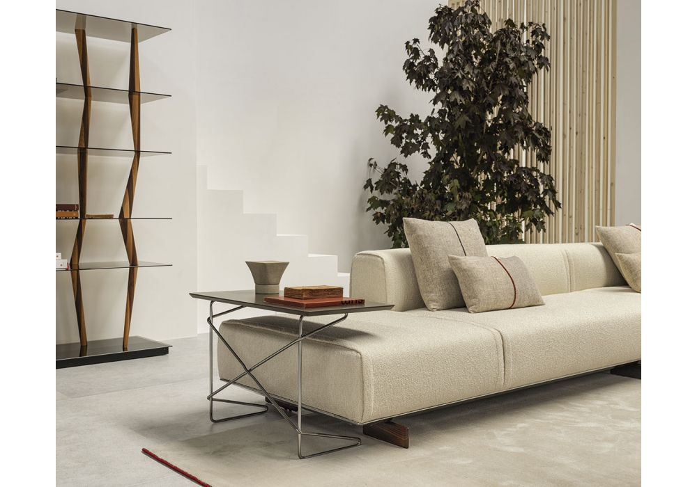 Coleman conçu par Ludovica & Roberto Palomba pour Casamania & Horm est un canapé réalisé avec structure en aluminium, pieds en noyer Canaletto massif avec âme en métal, coussins en mousse de polyuréthane à haute résilience de différentes densités. Les coussins reposent sur des sangles élastiques à haute teneur en caoutchouc insérées dans le cadre en aluminium. Disponible en différentes compositions.