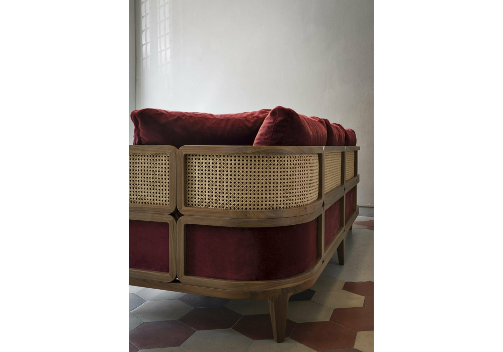Promenade conçu par Philippe Nigro pour Gebrüder Thonet Vienna est un canapé avec revêtement amovible. Structure avec profils en noyer canaletto et panneaux recouverts de tissu. Assise et coussins rembourrés en mousse de polyuréthane et plumes d'oie ou en polyester avec revêtement en tissu ou en cuir. Bande supérieure disponible en paille de Vienne ou avec rembourrage dans la même finition que l'assise. Le canapé est également disponible en deux tailles.