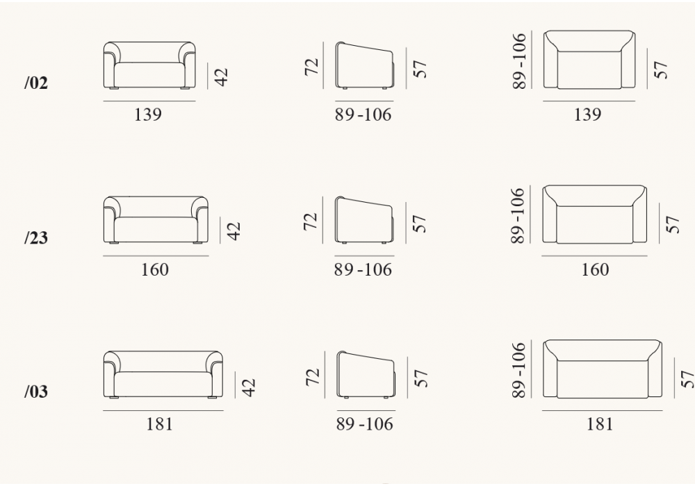 | Dimensions | -139 x 106 x H 72 cm; -160 x 106 x H 72 cm; -181 x 106 x H 72 cm. |