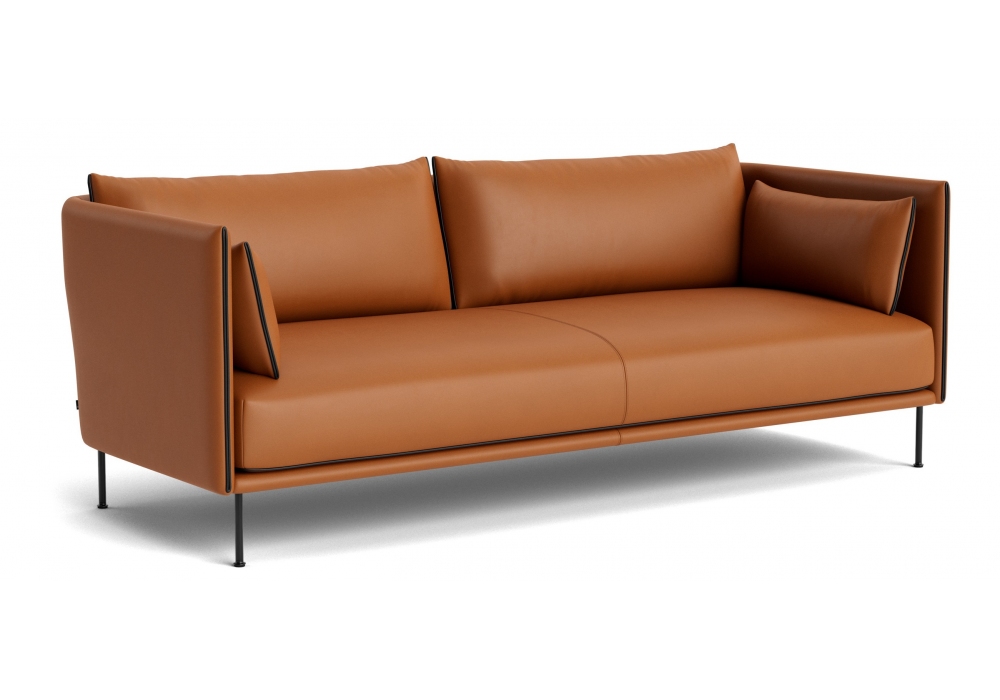 Silhouette conçu par GamFratesi pour Hay est un canapé deux ou trois places avec revêtement en cuir ou tissu, coussin d'assise en ressorts ensachés et mousse PU, coussins d'accoudoir et de dossier remplis de plume et de mousse granulée, pieds en acier peint, chromé ou massif chêne et passepoil en cuir ou de la même couleur que le tissu. Disponible en différents revêtements.