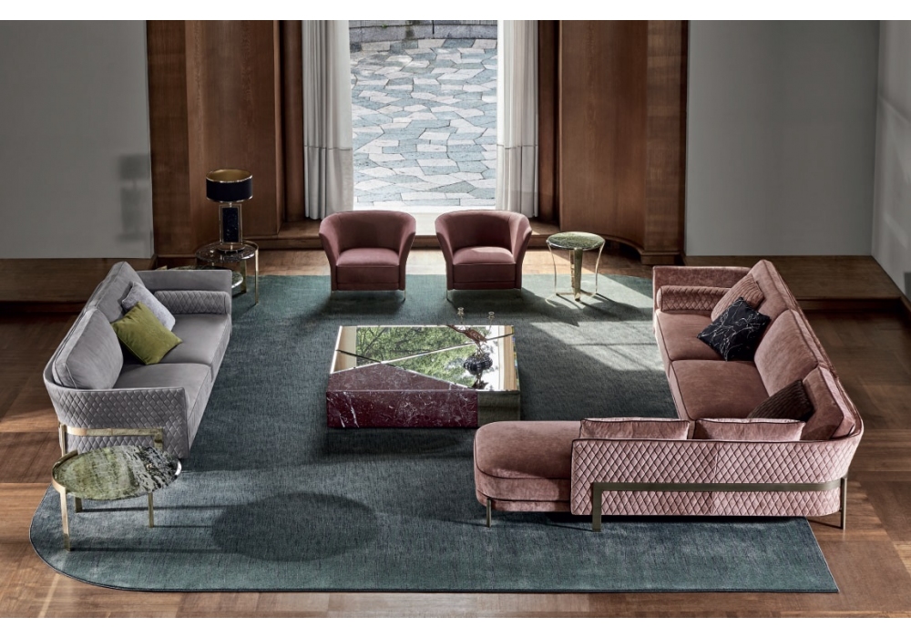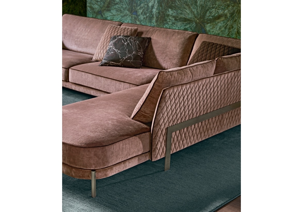 Cosmo conçu par Castello Lagravinese Studio pour Opera Contemporary est un canapé modulable réalisé avec un rembourrage en plumes avec insert en caoutchouc, structure en métal et revêtement en tissu ou cuir.