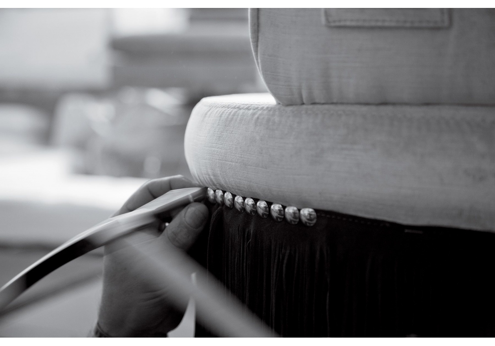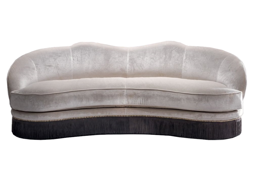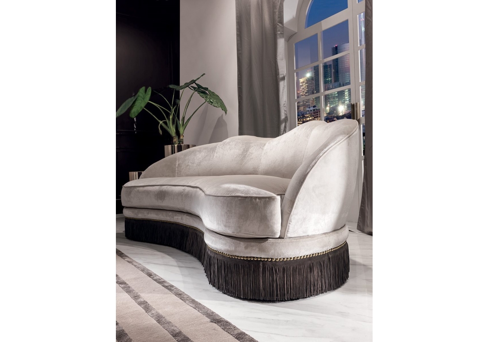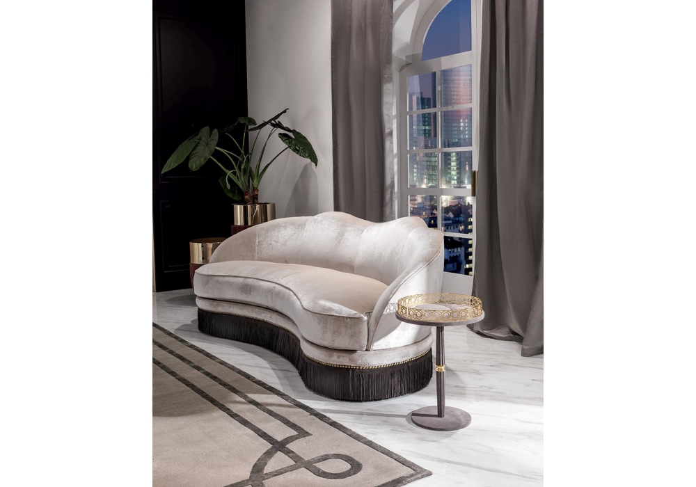Daisy conçu par Giuseppe Iasparra pour Longhi est un canapé avec structure en bois de hêtre avec sangles élastiques, recouvert de mousse polyuréthane haute densité. Coussins d'assise en plume oie stérilisée, avec insert en mousse de polyuréthane multidimensionnelle différencier. Revêtement en cuir ou tissu et piètement à franges en daim avec boutons métalliques ou assortis au revêtement.