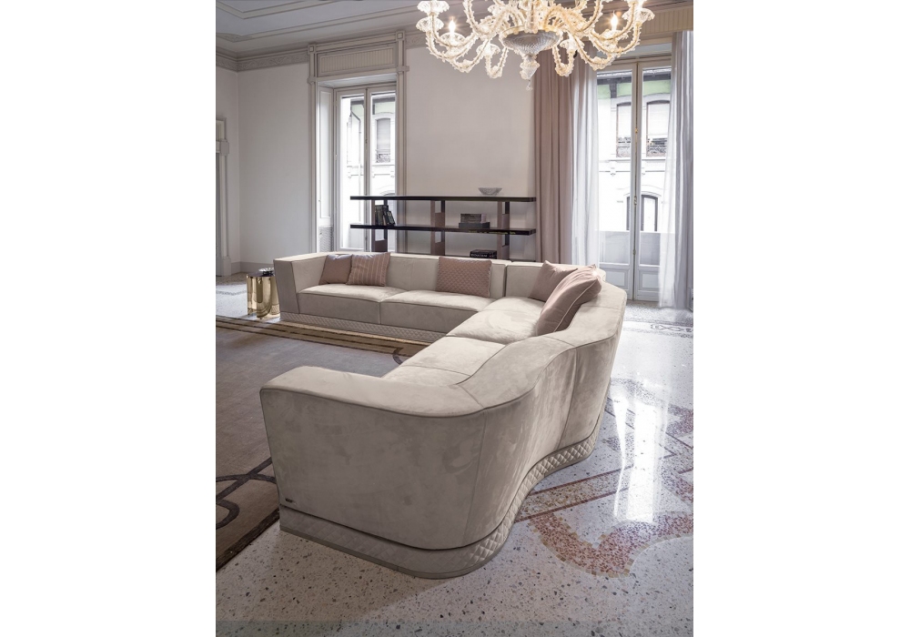 Welles conçu par Giuseppe Viganò pour Longhi est un canapé modulable avec bord inférieur en métal chromé brillant ou mat avec base avec revêtement uni ou matelassé en losange. Structure recouverte de cuir ou de tissu. Disponible en différentes compositions.