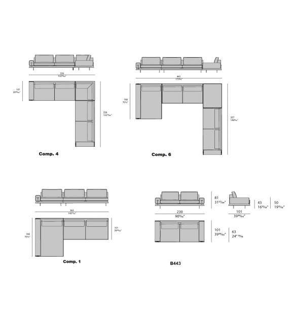 | Dimensions | Comp. 4_ 336 x 336 x H 81 cm; Comp. 6_ 441 x 357 x H 81 cm; Comp. 1_ 365 x 180 x H 81 cm; B443_ 230 x 101 x H 81 cm. |