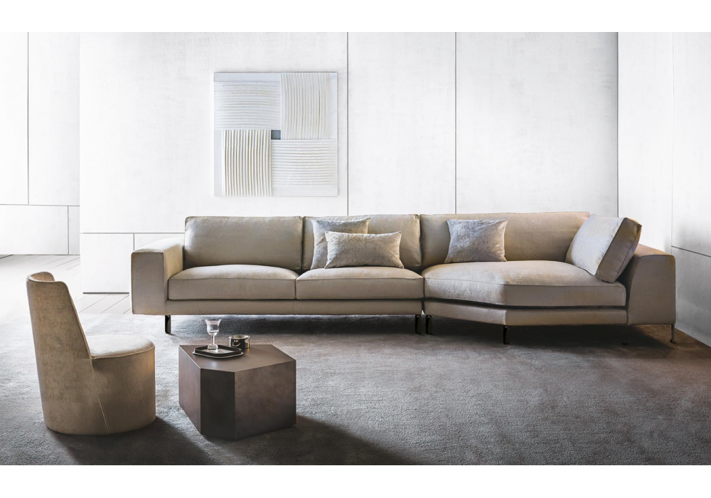 Hampton conçu par Castello Lagravinese pour Casamilano est un canapé modulable avec structure en sapin massif, contreplaqué de peuplier et panneaux de particules. Rembourrage en mousse de polyuréthane à densité différenciée et revêtement en tissu ou cuir. Pieds en métal peint en noir.